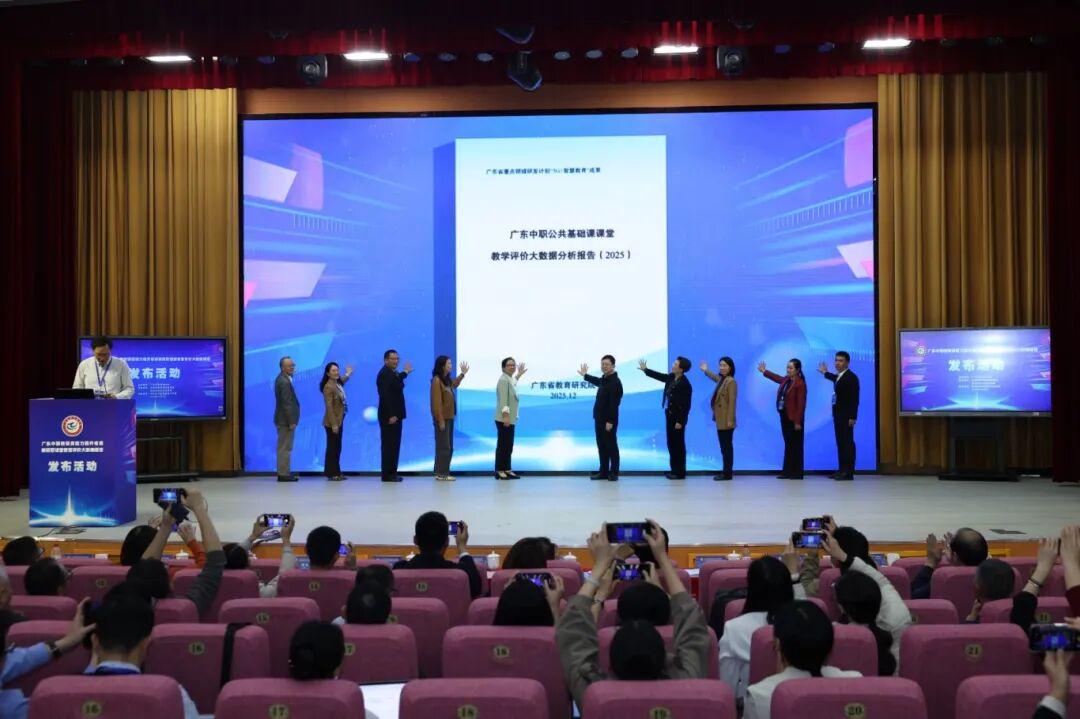 在发布典礼模范,十位与会辅导、大众代表都聚主屏幕前,手掌轻贴屏幕,跟着最先辅导发出,《广东中职环球基础课课堂教悔评价大数据论说(2025)》封面在屏上明晰呈现,记号着论说认真发布。