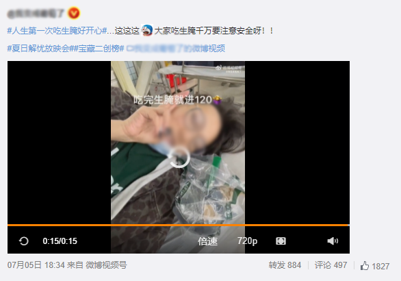 果真有这样严重吗?小编不敢尝试但合手怀疑格调,直到小编7月5日在微博上看到某博主发文:东谈主生第一次吃生腌好慷慨,然则转瞬就叫了120……